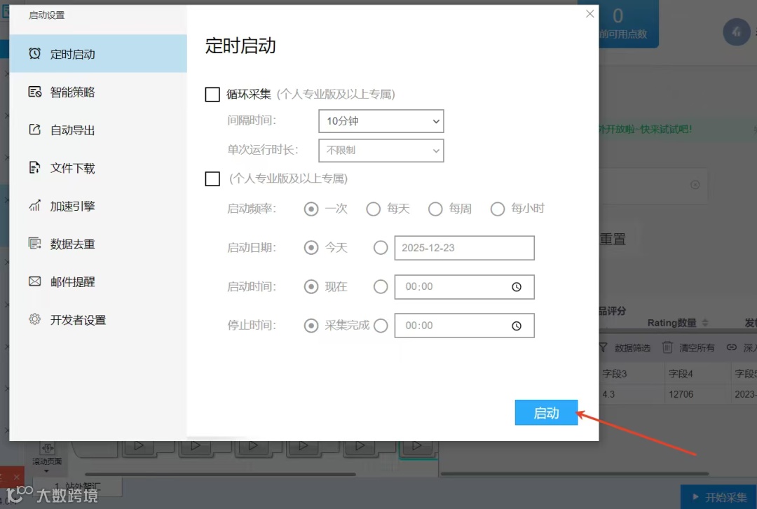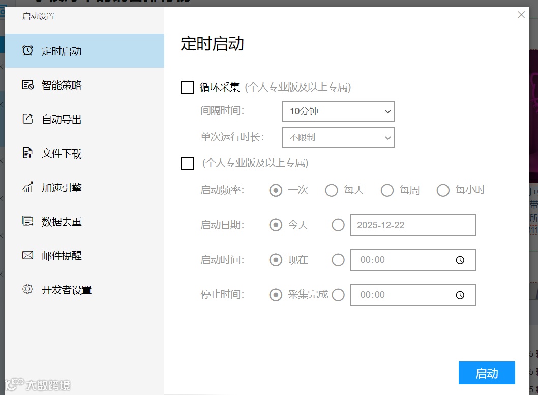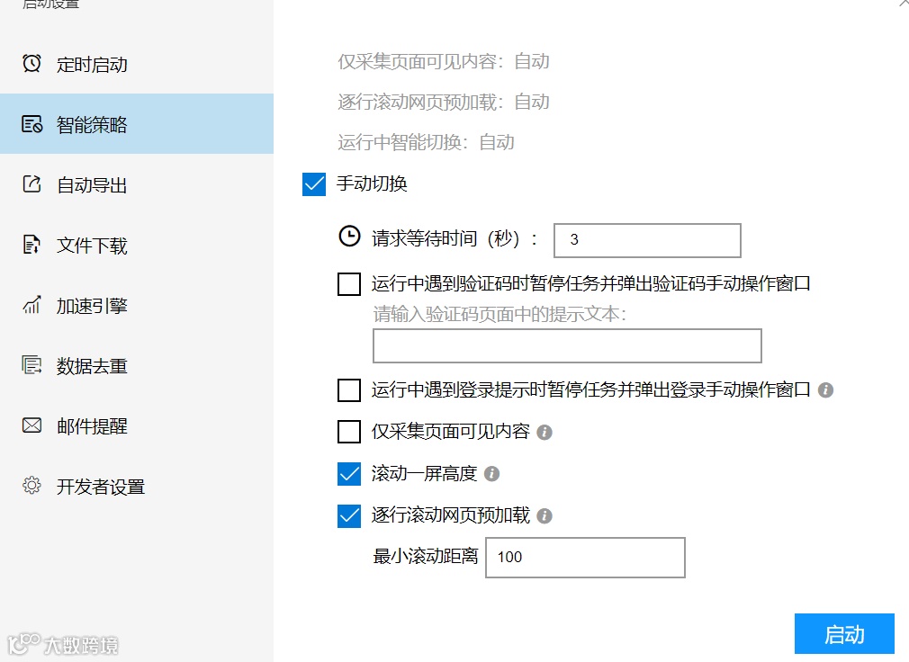 6,有些网站有爬机制,智能策略这里调整采集等待时间,然后启动