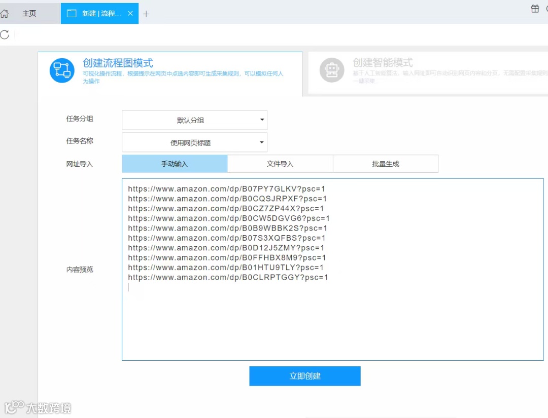 2,输入要采集的asin链接(最好是同站点,同类目,这样页面结构一致),然后立即创建