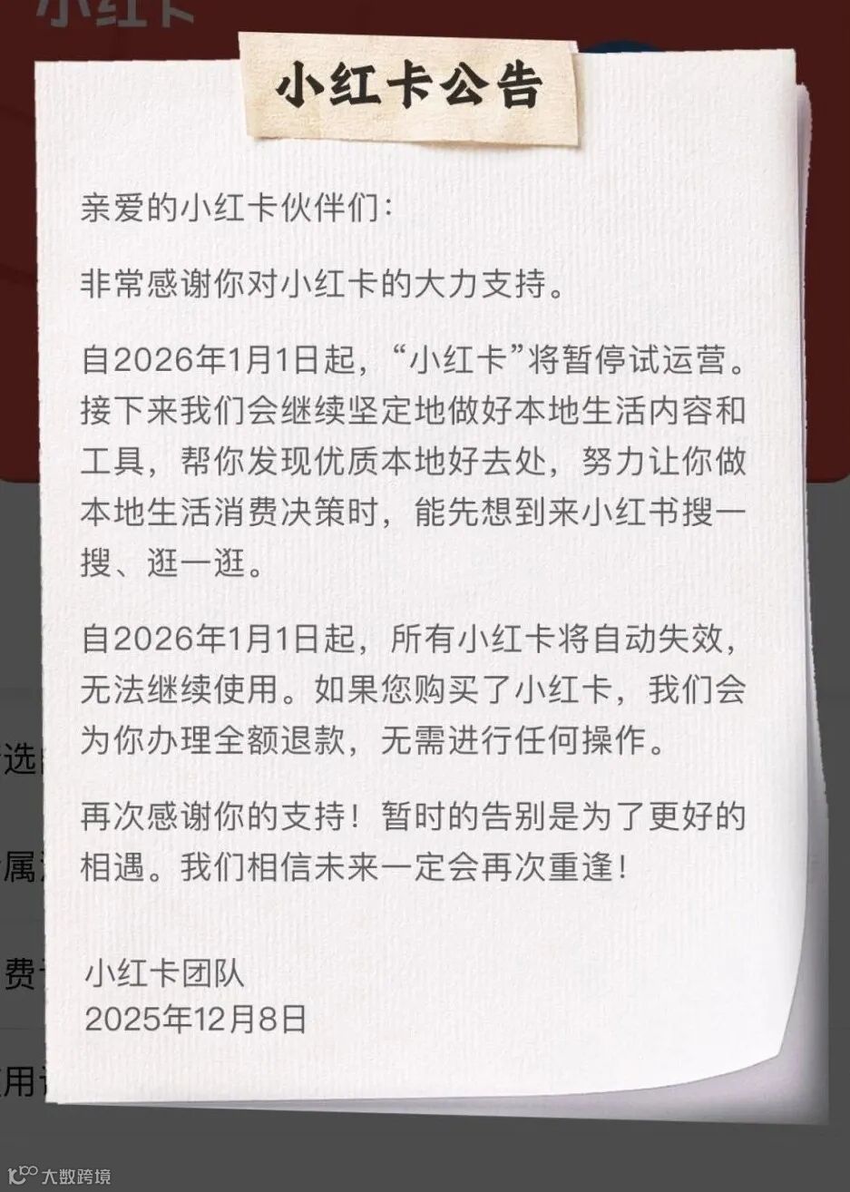 就在吴千语直播爆卖的第二天,小红书宣布2026年1月1日起暂停“小红卡”试运营,距离这款本地生活会员服务上线还不到百日。