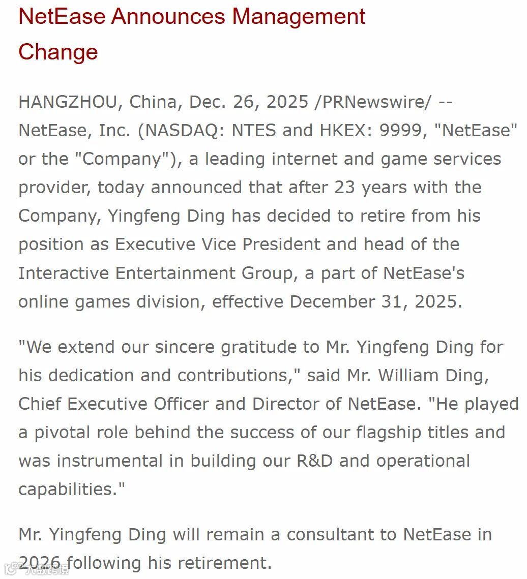 今日(12月27日),网易发布公告称,网易集团执行副总裁、网易互动娱乐事业部负责人丁迎峰(丁丁)将结束其在网易23年的任职,于2025年12月31日正式退休。退休后,他将继续担任公司顾问职务。