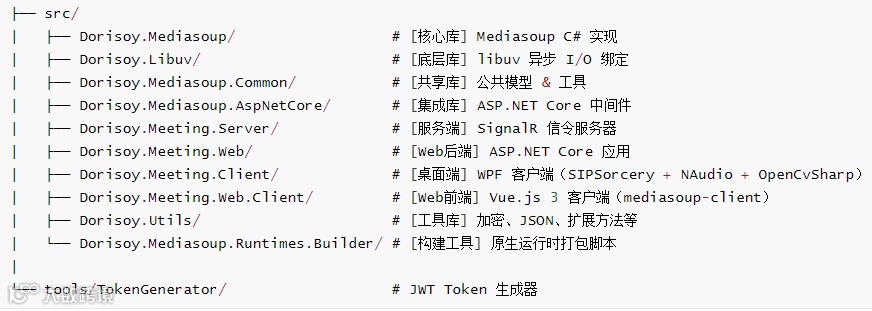 .NET 8、#Mediasoup、#SFU架构、#WebRTC、#实时音视频、#SignalR、#WPF客户端、#Vue.js、#SIPSorcery、#NAudio、#OpenCvSharp、三种服务模式、房间管理、活跃发言者检测、JWT认证、VP8/VP9/H.264、#Opus、#libuv、FlatBuffers、#Docker部署