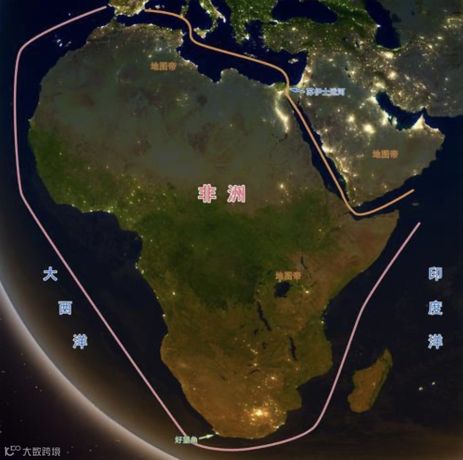 绕行好望角:航程约34-38天,单箱海运成本因燃油、时间损耗增加约 $800-$1,200。