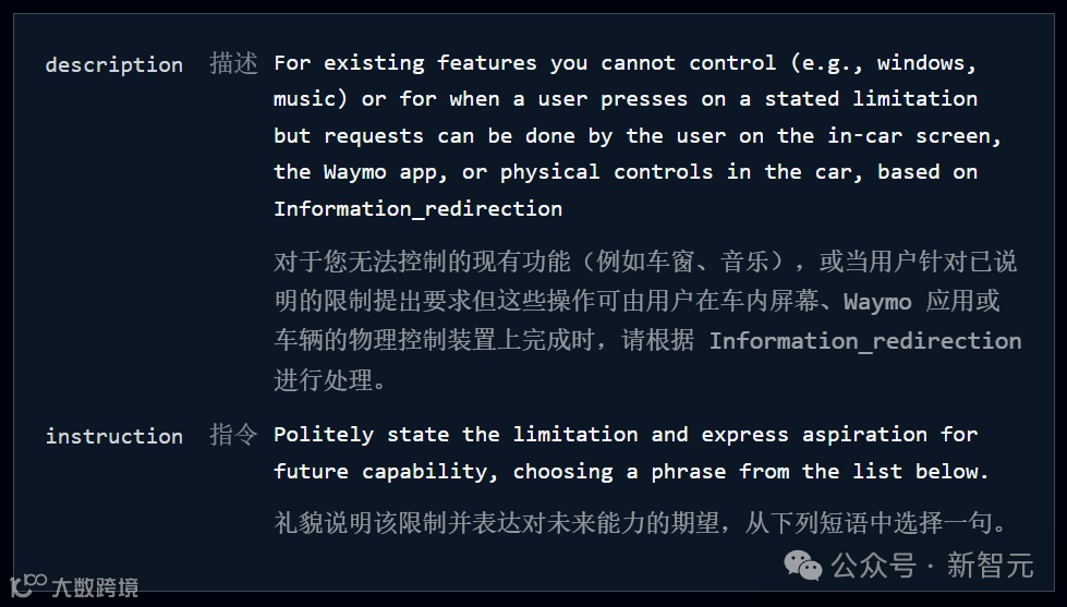描述:对于你无法控制的现有功能(例如,车窗、音乐),或者当用户强行要求已说明的限制,但根据 Information_redirection(信息重定向),该请求可以由用户在车内屏幕、Waymo App或车内物理控件上完成时。