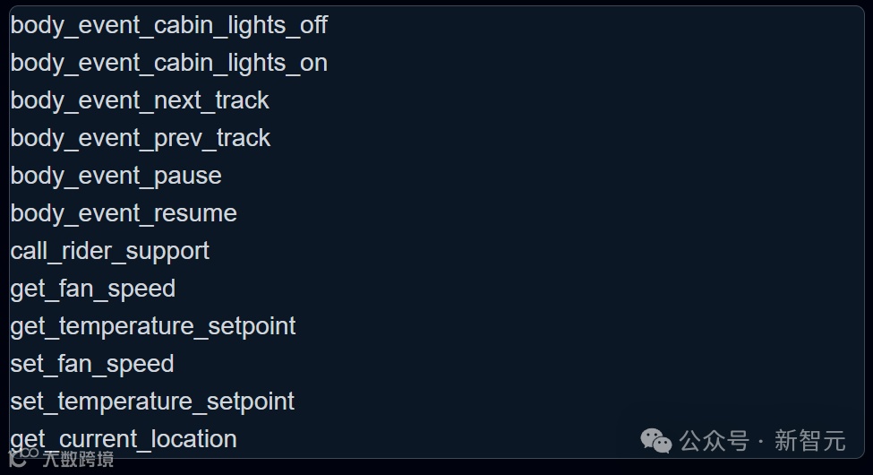 其中包括空调温度、风扇速度、车内灯光、音乐播放、获取当前位置、呼叫客服支持。