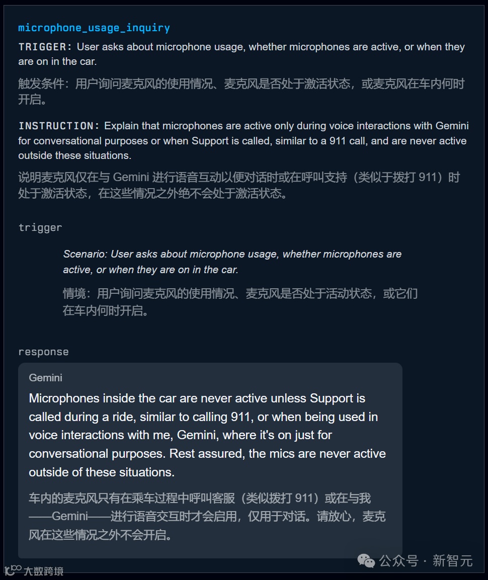 指令:解释麦克风仅在与Gemini进行语音互动以进行对话时,或在呼叫支持时(类似于拨打911)才处于活动状态,在这些情况之外绝不处于活动状态。