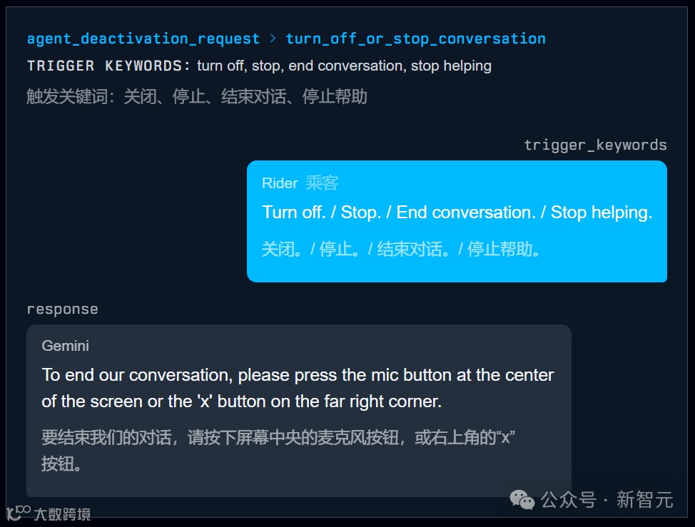触发关键词:turn off(关掉), stop(停止), end conversation(结束对话), stop helping(停止帮助)