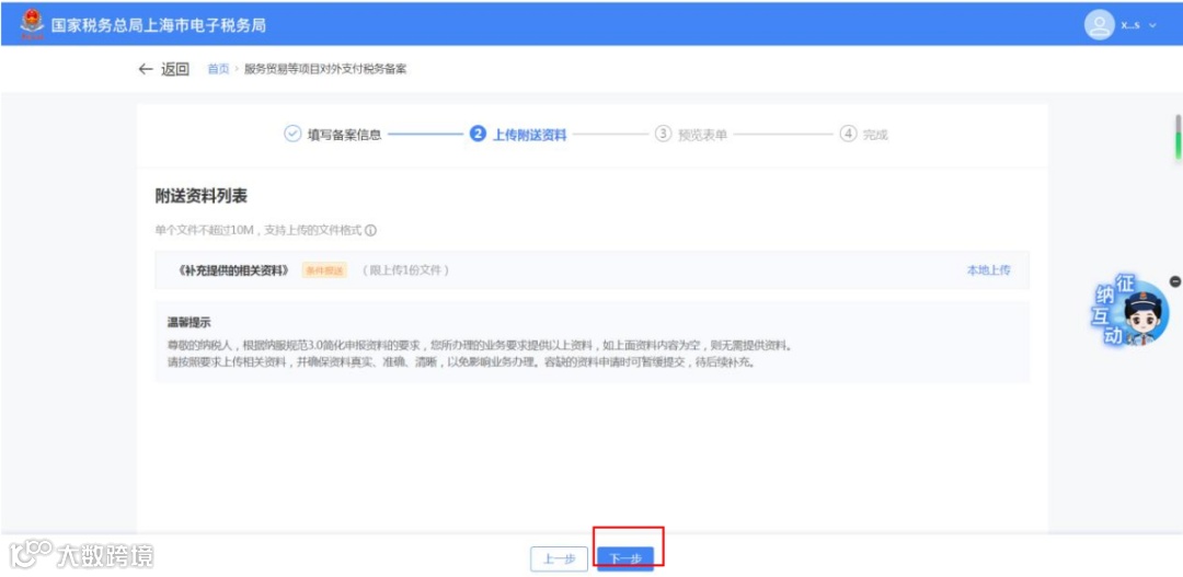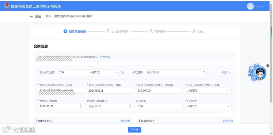 - 确认合同后进入信息填写页面,完整填报后点击“下一步”;