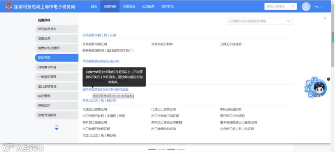 登录新电子税务局,依次点击【我要办税】→【证明开具】→【服务贸易等项目对外支付税务备案】。