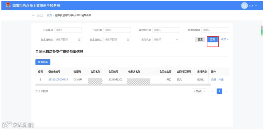 输入查询条件(如备案时间、合同名称、备案状态等),点击“查询”即可查看历史备案记录。