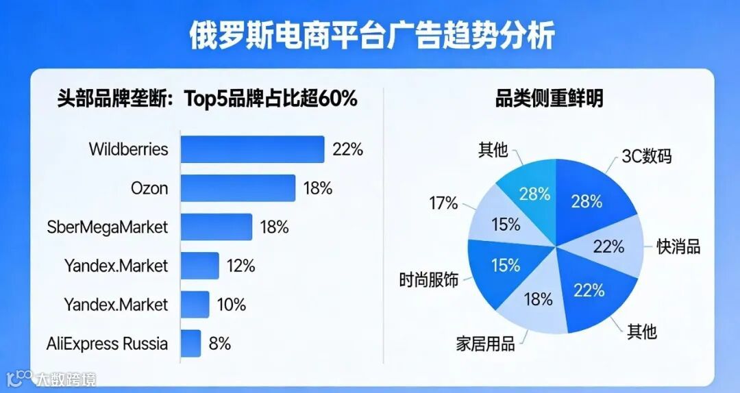 Easy Commerce基于2025年4–8月数据发布的研究显示:20%头部广告主垄断Wildberries、Ozon等主流平台71%–89%首页广告位;各平台广告品类侧重明显,如Wildberries聚焦时尚、Ozon侧重日用品 [4] 。