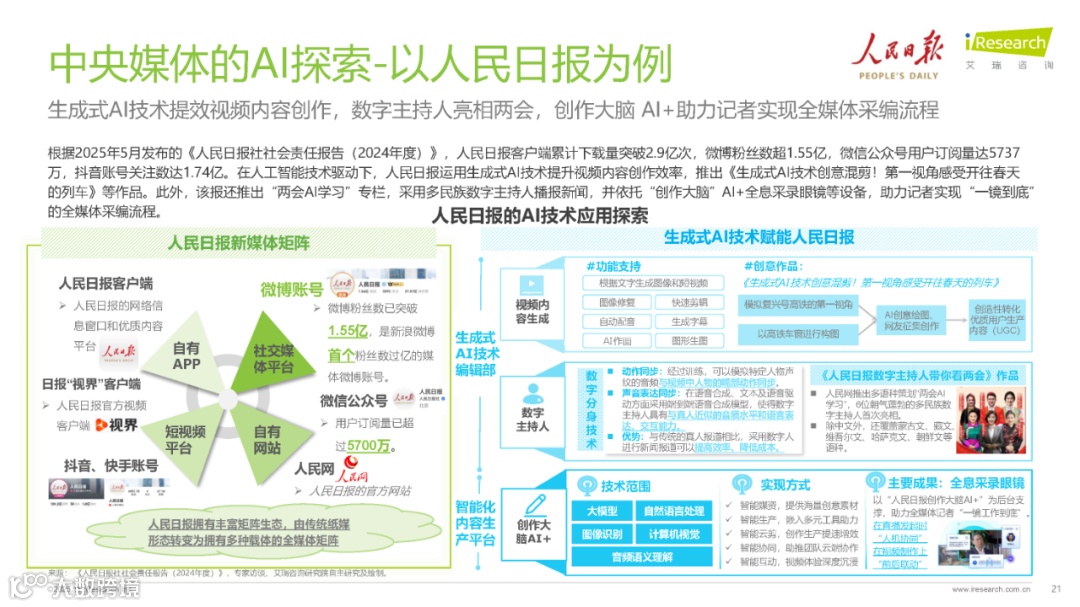 人民日报应用生成式AI完成视频创意混剪与多民族数字主持人新闻播报,显著提升全媒体采编效率;澎湃新闻设立三大AI工作室并上线“清穹”内容风控智能平台,在提效同时筑牢内容安全底线。此类实践为行业提供了可复用的技术路径与组织范式。