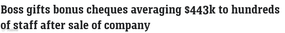 美国路易斯安那州企业Fibrebond前CEO Graham Walker在以17亿美元出售公司时,坚持要求买家Eaton将出售收益的15%(约2.4亿美元)分配给540名全职员工,人均约44.3万美元,分五年发放。
