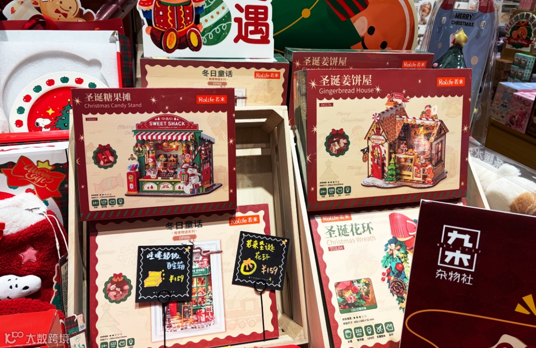 圣诞季来临,《21CBR》记者在九木杂物社看到,“圣诞姜饼屋”“圣诞花环”等DIY木质拼装玩具被摆在显眼位置,占据整面货架,吸引大量年轻消费者选购。