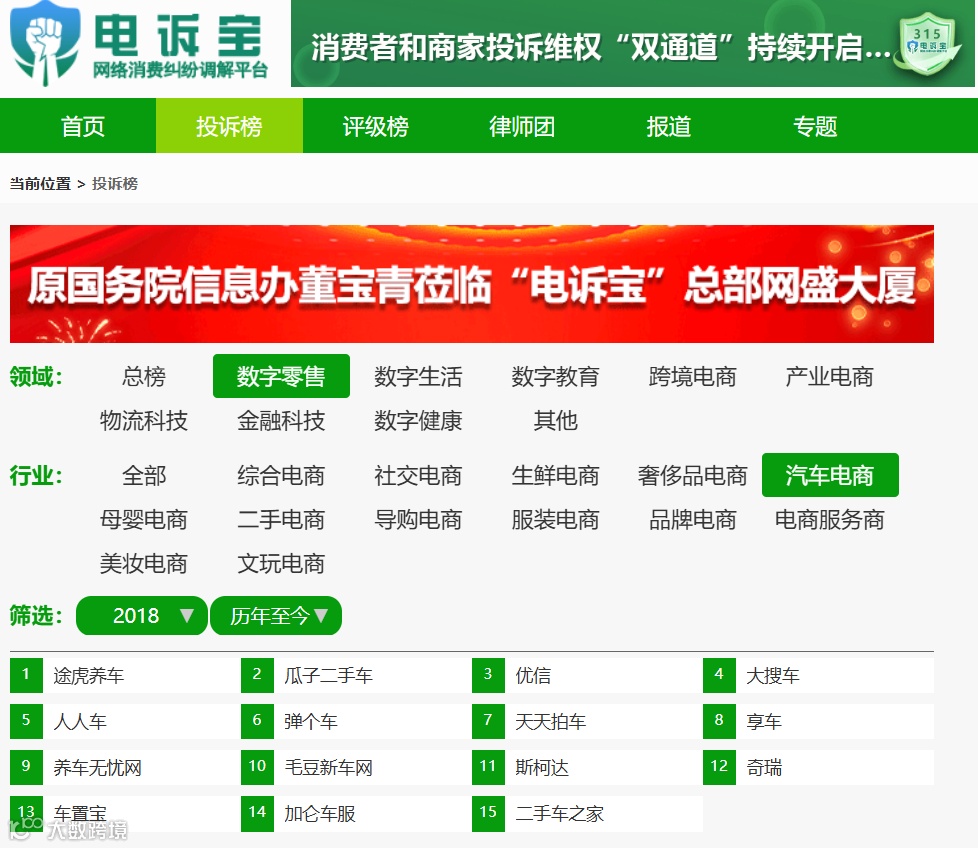 此外,2018年至今,“电诉宝”受理投诉中涉及的数字零售中汽车电商领域用户有效投诉显示(依据投诉量排行),依次为:途虎养车、瓜子二手车、优信、大搜车、人人车、弹个车、天天拍车、享车、养车无忧网、毛豆新车网、斯柯达、奇瑞、车置宝、加仑车服、二手车之家。