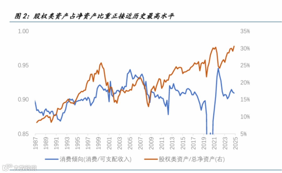 2023年初至2025年中,美国居民财富增长约20万亿美元,主要源自企业权益类资产增值,但该类资产高度集中于富裕阶层。