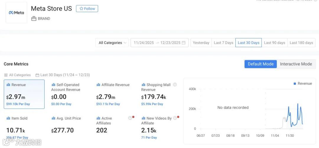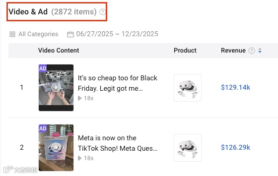 而在TikTok,Meta不是试水,不是象征性上架,而是直接冲量。看看11月底到12月底,黑五+圣诞这30天的数据,表现非常强势: