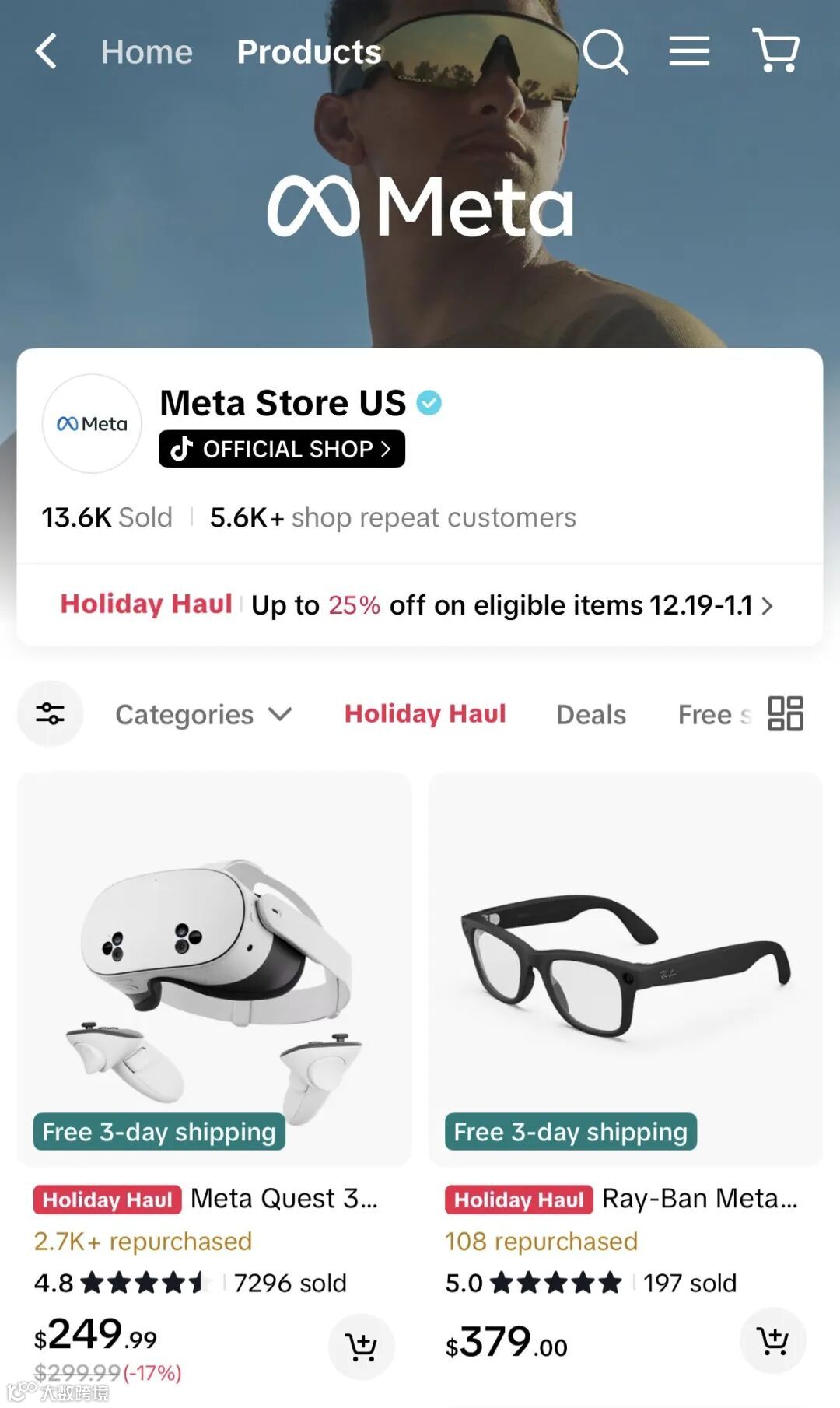 在亚马逊,Meta用VC账号的模式,分别给两个智能硬件产品线Quest 3和Ray-Ban Meta建立了一个店铺,让亚马逊做主导。而在TikTok Shop,它也悄悄卖智能眼镜和VR头显,做自己的品牌店铺。当别人都以为它在试水,没想到它是全力投入,销售十分火爆!
