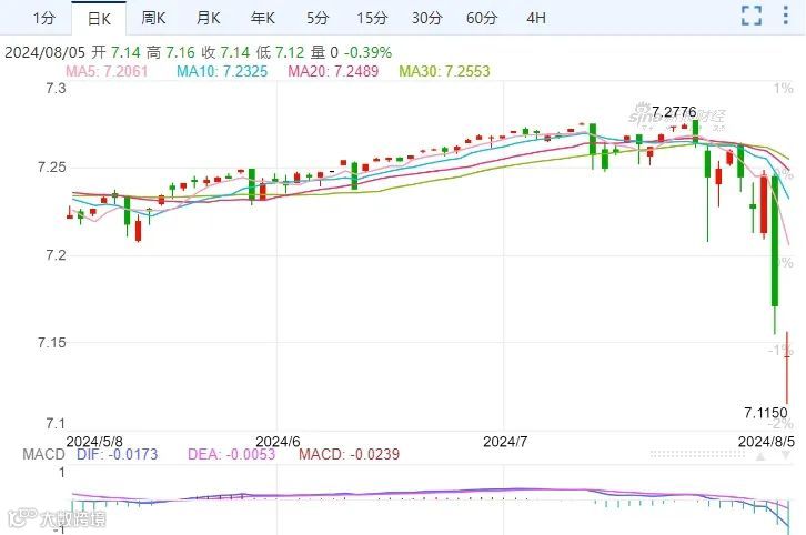 上周五(8月2日),人民币汇率出现明显升值,在岸人民币对美元汇率从7.2440涨到最高点7.1524,离岸人民币对美元汇率则从7.2539涨到最高点7.1429,盘中最大涨幅分别超过900个基点和1000个基点。