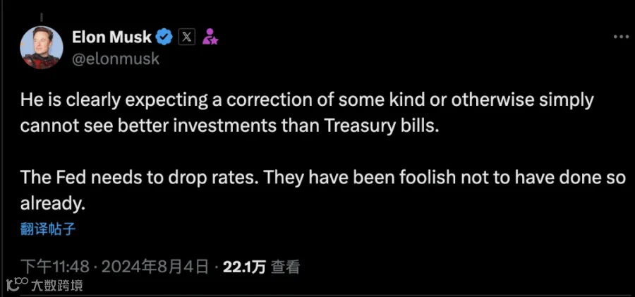 特斯拉CEO、亿万富翁埃隆·马斯克就于上周日(8月4日)借巴菲特抛股的帖子来表达对美联储的不满。马斯克曾不止一次呼吁美联储降息,因为高利率增加了购车成本,从而打压了人们对特斯拉电动汽车的需求。他在X上表示:“美联储需要降低利率,他们还没有这样做(降息)是愚蠢的。”
