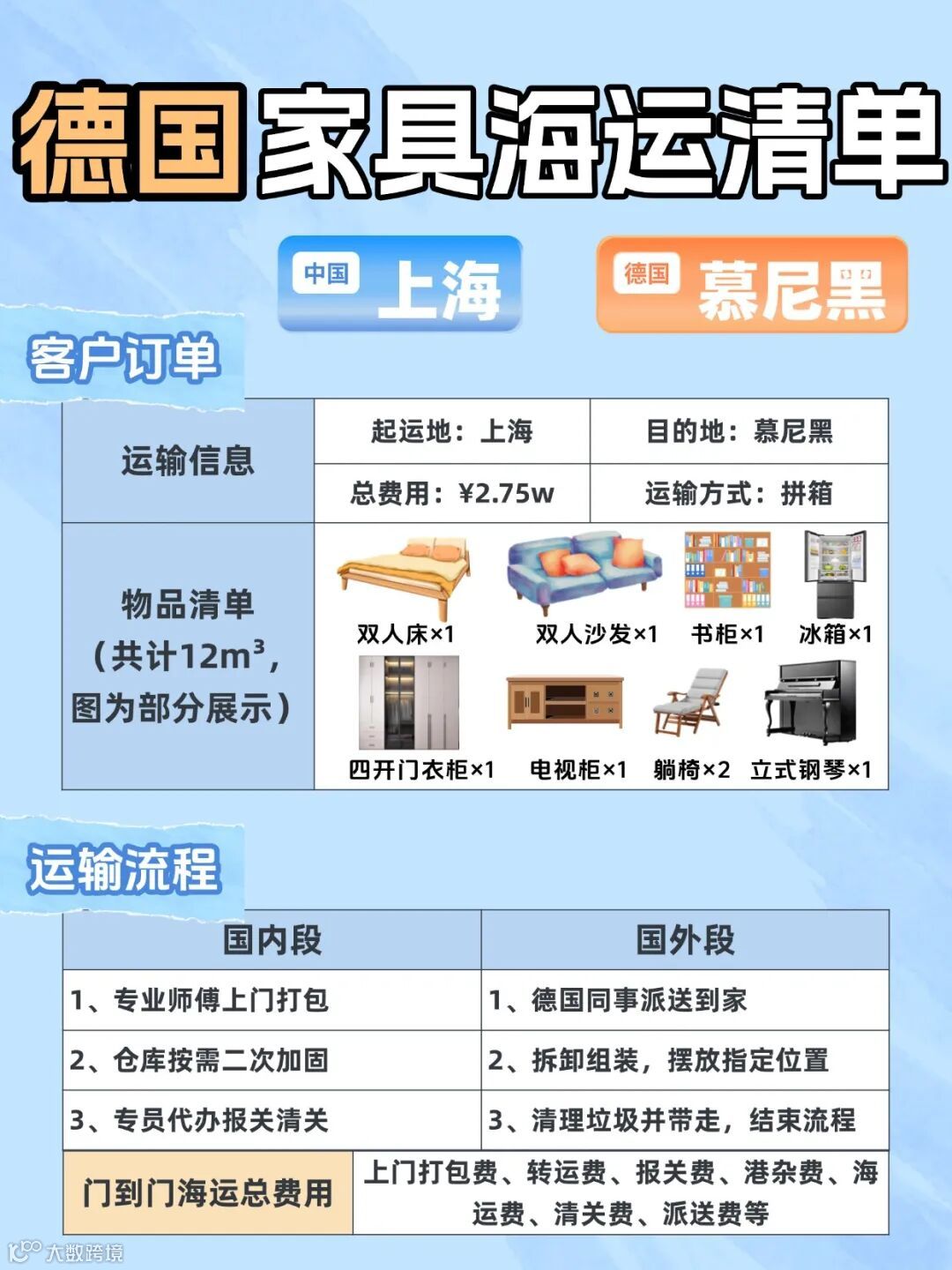 清关完成后,德国当地团队会提前沟通派送时间。家具不仅送到家里,还会帮忙拆包组装再摆好,产生的垃圾全都会带走,全过程不用您亲自动手~