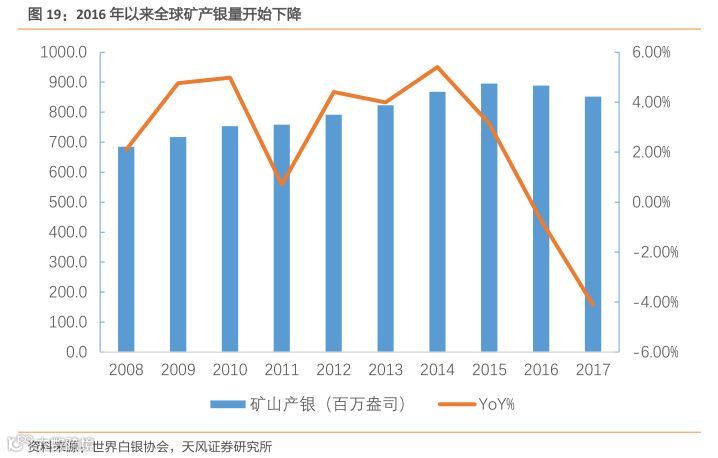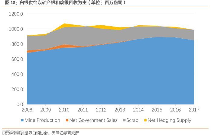 从全球白银供应结构来看,几乎全靠矿产银和再生银,2017 年二者占比分别达到 85.9%和 13.9%。 从历史趋势来看,全球总的白银供给量在 2010 年达到 10.75 亿盎司的顶峰后呈逐年下降的趋势,在 2017 年下降至 9.92 亿盎司。其中废料供应从 2011 年最高时的 2.6亿盎司下降到 2017 年的 1.38 亿盎司。而矿产银方面也是在多年持续稳定增长后进入负增长区间,在 2015 年达到顶峰的 8.95 亿盎司后小幅回落至 2017 年的 8.52 亿盎司。