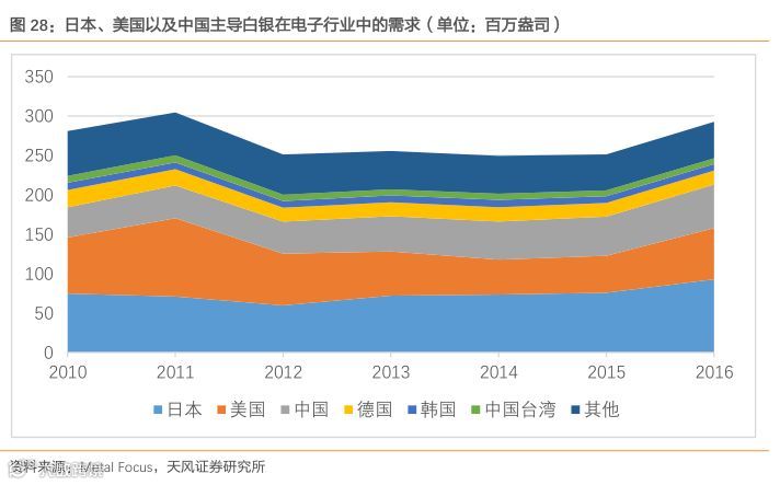 白银应用于电子的各种行业中,包括汽车、消费电子、工业设备、国防和航空航天等,目前需求体量较大的国家为日本、美国以及中国。根据 Metal Focus 2017 年白银行业报告显示,日本、美国、中国于 2016 的电子白银需求分别为 0.93 亿盎司、0.65 亿盎司和 0.55 亿盎司,同比增长 22%,38%和 11%。