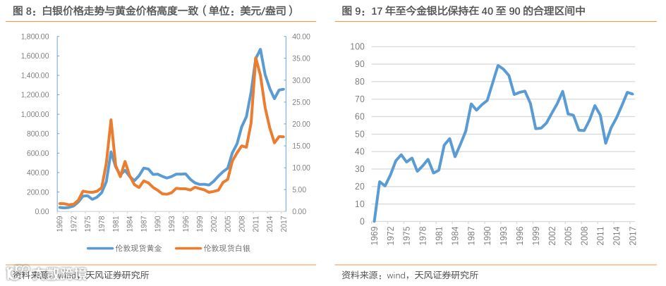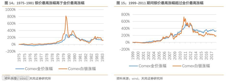 从历史数据来看,黄金和白银价格走势呈现出非常强的相关性。我们统计了1975 年至 2018 年的 Comex 月度黄金和白银的均价,发现其相关系数高达0.896,显示出黄金和白银的价格高度相关。分阶段数据来看,在贵金属价格的上涨期间,银价上涨幅度通常要高于金价上涨幅度。