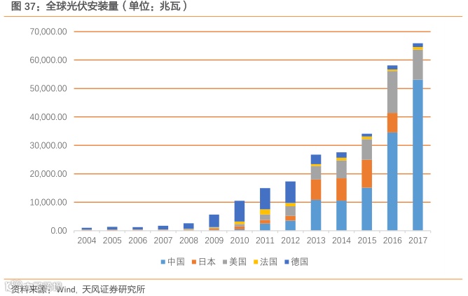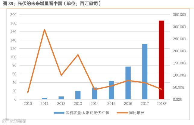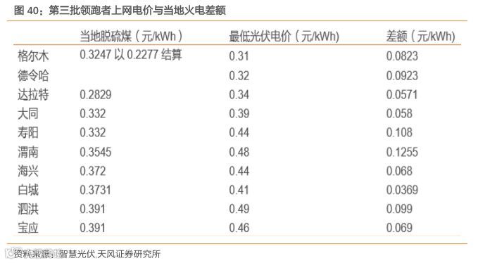 国内 光伏发电距离平价仅差一步之遥,行业爆发在即。现阶段我国光伏度电成本还同国内的火电上网标杆电价有一定差距,但通过管控非技术 成本,光伏的度电成本同火电的差距越来越小,从第三批领跑者的招标电价来看,光伏电 价与当地的火电差价在0.0369-0.1255 元/kWh,差距进一步减小,随着成本下降,效率的提升,预期 2019 年新的领跑者项目的上网电价与火电差额将进一步缩小,或将在领跑者项目上首先看到平价项目。