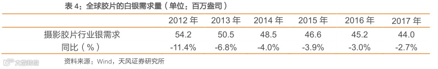 从胶片全球总白银需求来看,近年以来下降幅度开始变小。根据世界白银协会的数据,2017年摄影行业的白银需求为 0.44 亿盎司,同比下降 2.7%,相较于 12 年的 11.4%的下降幅度,目前胶片白银需求趋势平缓,进一步大幅下降的空间有限。