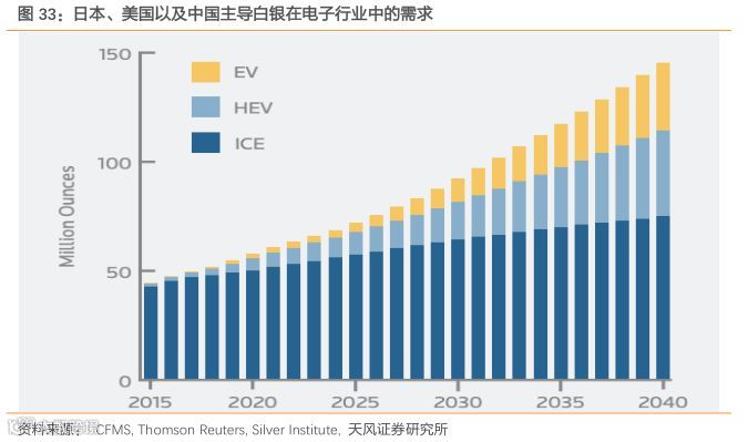 从未来汽车白银需求量来看,根据世界白银协会公布的 2018 年世界白银调查报告,至 2040年,电动汽车和混合动力汽车将电动汽车和混合动力汽车将占全球汽车行业白银需求的一半以上。届时汽车行业的白银需求量将接近于 1.5 亿盎司,是 17 年的三倍。新能源汽车的产量增长也成为了电子行业未来白银需求的可期增长点。