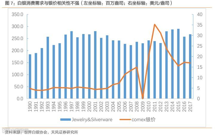 世界白银协会自 1990 年以来将投资需求(Bars & Corns)与消费需求(Jewelry andSilverware)分开统计,我们统计了 1990 年至 2017 年白银投资需求与银价,发现白银的投资需求与银价呈显著正相关,其相关系数高达 0.799。