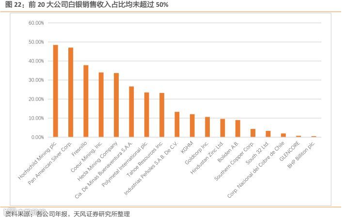 从各公司收入占比来看,前 20 大白银生产企业白银销售收入占比最高的为 HochschildMining plc 的 48.42%,其次为 Pan American Silver Corp. 的 47%,全球第一大银矿企业Fresnillo 白银销售收入占比为 37.82%,其余大多数公司白银销售占比并不高。