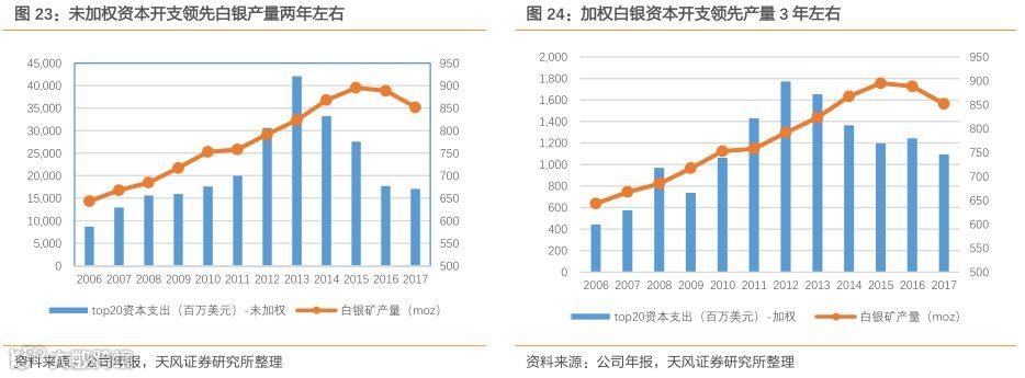 将历史上这些企业的资本开支与产量数据经行回测,发现对于白银产量来说,资本开支是一个比较好的领先指标。如果按照全公司资本开支的口径来看,资本开支领先白银产量 2年左右;如果按照白银销售收入占比来加权,得到白银单一品种的资本开支领先白银产量3 年左右。无论是哪种口径,企业资本开支在 2012-2013 年均达到顶峰并且开始逐年下降,因此未来 2-3 年矿产银产量大概率将继续处于下降趋势。