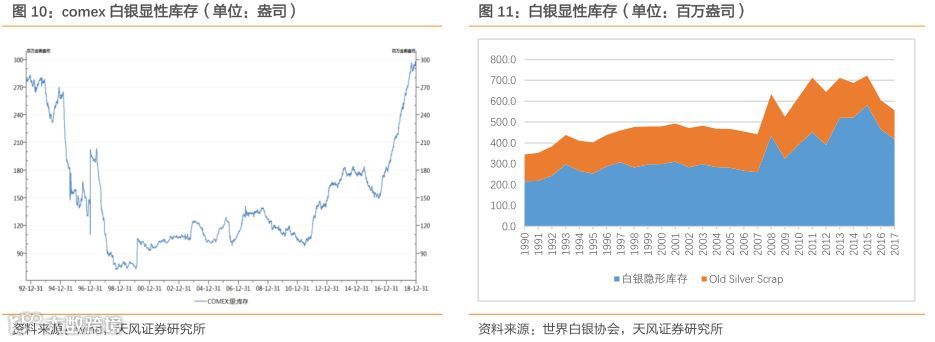 虽然白银的终端需求构成中,工业需求占比超过 60%,但是一般我们认为工业属性决定价格的假设是库存量与年度需求量的比值处于极低的水平。从Comex 数据来看,截至 2018 年 12 月 31 日白银显性库存就高达 293.9 百万盎司,占 2017 年全球需求量的 29%,而白银的需求中珠宝首饰和银币银条极易回收,都可以看做为长期隐形库存的一部分。因此白银虽然工业需求占主导作用,但跟其他工业金属相比有着明显的不同。