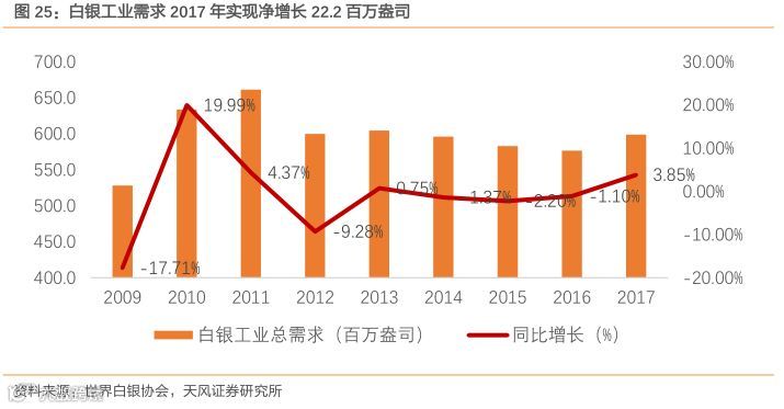 根据世界白银协会公布的数据显示,自 2011 年开始,白银工业需求呈现着下降的态势。但近年以来,随着新能源汽车产业的兴起,以及中国光伏产业的稳步发展,白银工业需求止住颓势,并在 2017 年实现了 5.99 亿盎司的需求总量,同比增长 3.85%。