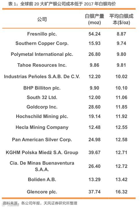 从公司层面来看,全球最大的白银生产企业 Fresnillo plc 2017 年平均白银生产成本在 8.87美元/盎司,而成本最高的 Glencore plc 2017平均成本在16.32美元/盎司,低于全年Comex白银 17.05 美元/盎司的均价。
