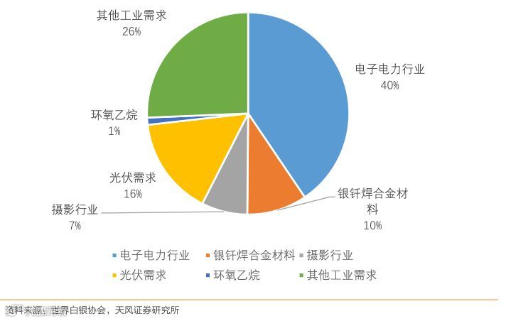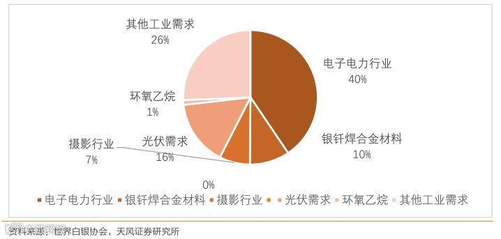 从工业需求结构来看,电子电力、光伏、摄影胶片、银钎焊合金材料等为主要的下游需求。目前来说,白银作为拥有最佳导电性的金属,在工业需求上面还是以电子电力的需求为主导,占工业需求的 40%左右。虽然目前光伏行业工业需求占比只有 16%,但从未来的趋势来看,光伏或成为下一轮白银工业需求爆发的增量。