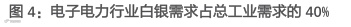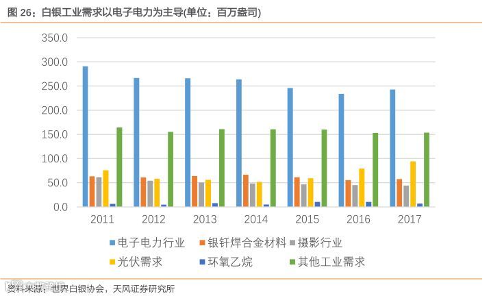 白银出色的导电性特征让其在高质量、高性能的电气触点中占有不可取代的地位,工业中主要应用于电子电力、银钎焊合金材料、摄影胶片以及光伏等。根据世界白银协会公布的数据显示,2017 年全球白银工业总需求为 5.99 亿盎司,电子电力行业需求量为 2.43 亿盎司,占总需求的 40%。此外,光伏以及银钎焊合金材料需求占比分别为 16%和 10%。