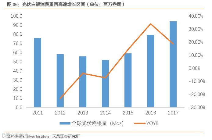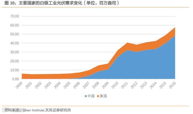 2017 年光伏产业的快速增长推动了对白银的需求提升,从 2016 年的 7930 万盎司增长至2017 年的 9410 万盎司,年增幅达 19%。而其中主要的增量来自于中国以及美国光伏装机容量的提升。