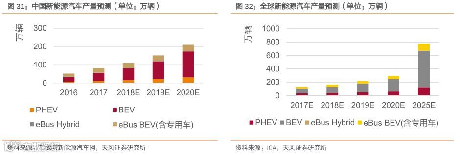 从未来产量预测来看,根据 2020 汽车产销规模达 3000 万辆,其中 7%是新能源汽车进行测算,我们预期 2020 年中国将实现 210 万辆新能源汽车产量。同时结合 ICA 公布的全球新能源汽车产量数据,调整了中国产量后,2025 年全球将实现 775 万辆的产量,新能源汽车增长可期。