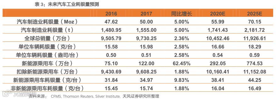 2017 年汽车制造业总耗银量约为 0.5 亿盎司(1555 吨),其同比增长速率(5%)大于汽车总产量增长速率(2.36%),并且远大于扣除新能源乘有车后的汽车产量增长速率(1.88%)。我们通过测算,估计2017年单位车辆耗银量为15.98克/台,其中新能源车辆耗银量为34.97克/台,非新能源车辆为 15.74 克/台。根据 2018 年世界白银调查报告,协会估计电动汽车和混合动力汽车各自消耗的白银量约为 1 盎司(31.1 克),内燃机则为半盎司白银(15.1克)左右,符合我们的测算结果。