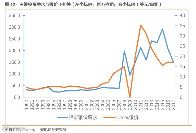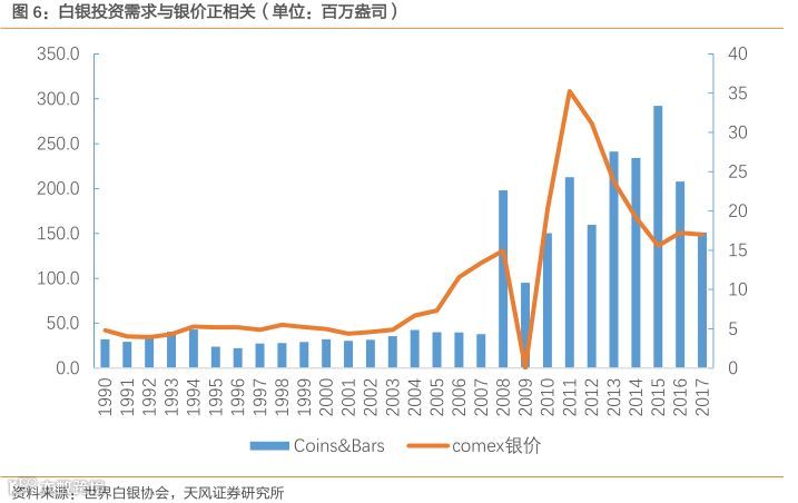 银币和银条的需求在白银货币属性退却之后大幅下降,但随着全球货币体系的重构之后,白银的投资需求依然存在。在这里我们将世界白银协会统计的 Coins&Bars 的需求定义为投资需求,从历史数据来看,投资需求往往与银价呈正相关关系,具有自我强化的效果。
