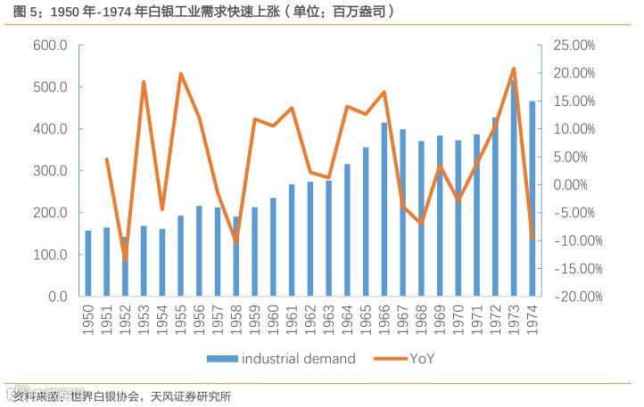 从历史上看,白银曾经作为硬通货流通。布雷顿森林体系解体后,随着各国央行出售白银,并且不再将白银作为官方储备货币,白银逐步退出货币属性的历史舞台。从目前的需求结构来看,工业需求占白银总体需求的 60%以上,是白银作为后货币时代的主要用途。