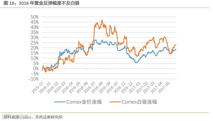 2016 年的黄金的反弹呈现出类似的规律,2015 年 12 月至 2016 年 8 月,白银价格最高涨幅超过 40%,而同期黄金价格上涨幅度不到 30%。