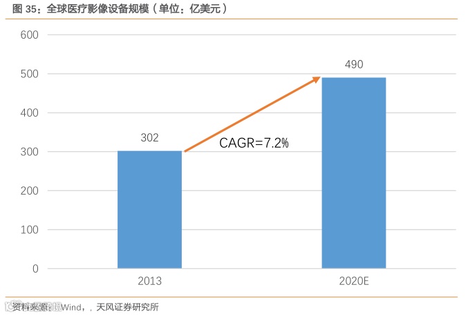 传统胶片摄影以及电影行业受到数码摄影的冲击,而医疗以及工业胶片方面依旧维持着稳定的刚性需求。全球医疗影像设备 2013 年达到 302 亿美元,预计到 2020 年达到 490 亿美元的规模,2013-2020 年 CAGR 为 7.2%,其中到 2020 年中国占据 12%的市场,即 58.8 亿美元。尽管从长期来看,数字 x 线摄影产品取代模拟 x 线摄影产品为大势所趋,但考虑到成本因素,中短期来看,模拟 x 线摄影产品依旧将带来稳定的胶片需求量。