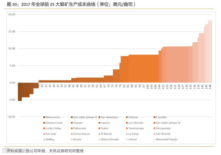 全球前 20 大银矿生产企业中只有 10%左右的供给来自于原生银矿,而大多数还是来自于铅锌以及黄金矿伴生的银。全球前 25 大银矿白银产量之和为 146.7moz,占全球银矿产量852.1moz 的 17.21%,而其中只有 16 个矿山为原生银矿。在这 16 座原生银矿中,成本最低的为 Fresnillo 矿山,成本仅仅为 0.7 美元/盎司;成本最高的为 Manantial Espejo 矿山,成本高达 18.25 美元/盎司。