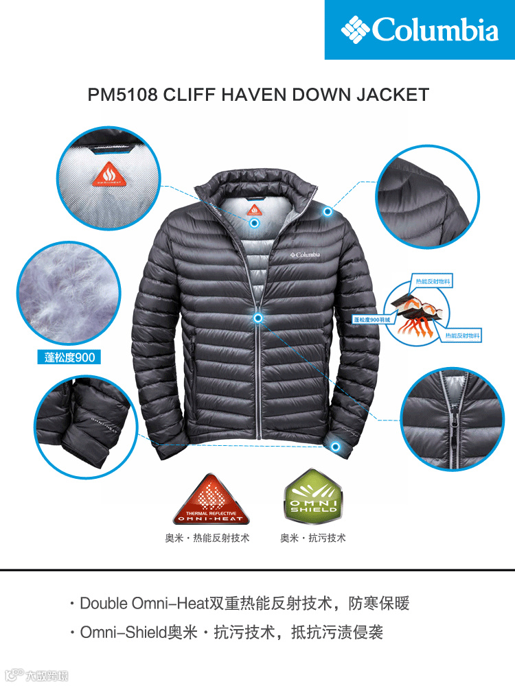 Columbia羽绒服蓬松度覆盖500–800P,部分高端型号如CLIFF HAVEN DOWN JACKET(PM5108)采用900蓬白鹅绒,达到行业顶级标准,具备超强压缩性与保暖性。