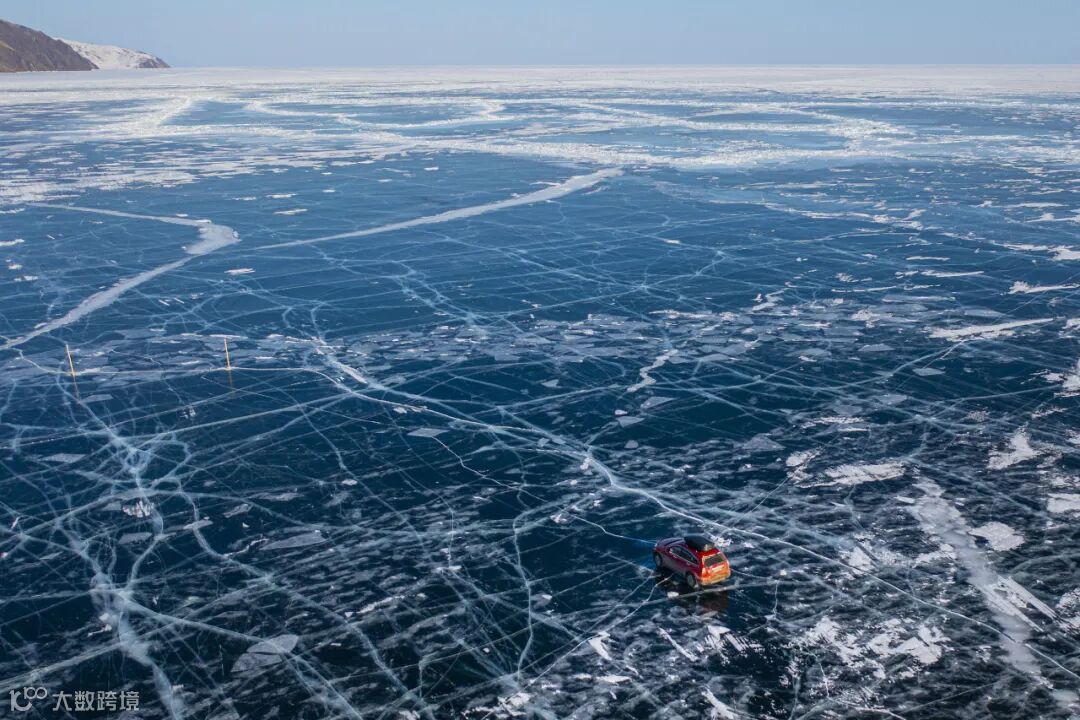 越野车驶向冰面,在幽蓝的世界中穿行