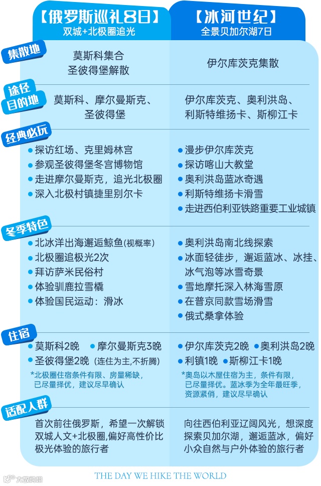 【冰河世纪】专注贝加尔湖,以伊尔库茨克为中心真正“绕湖一圈”,把奥利洪岛、利斯特维扬卡、斯柳江卡、玛玛伊山脉全部串联起来。适合只想去贝加尔湖一地、深度感受西伯利亚风光的你。
