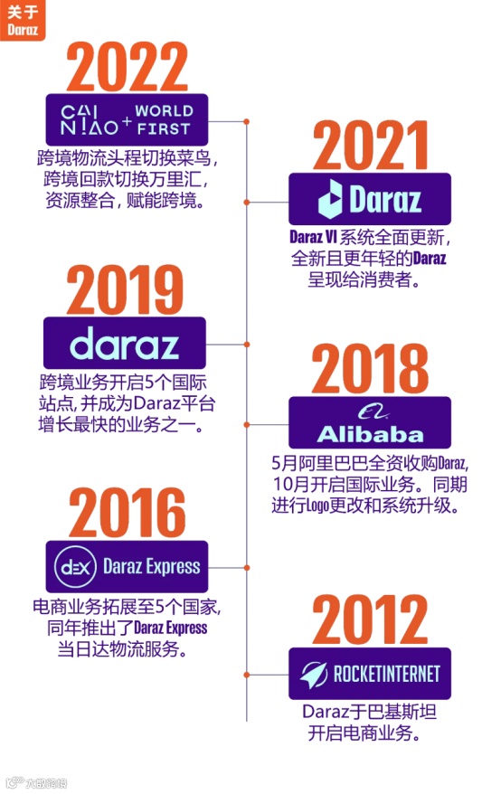 Daraz由Rocket Internet于2012年孵化,最初在巴基斯坦开展电商业务,2016年拓展至孟加拉国、斯里兰卡、尼泊尔和缅甸。2018年5月,阿里巴巴完成对其的全资收购,将其定位为南亚核心电商平台。目前,Daraz覆盖5个国家,服务近5亿人口,拥有3000万月活跃用户,致力于在2030年前为1亿客户和卖家提供服务。